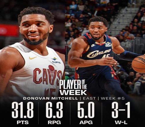 11月25日,NBA官方公布了第5周东西部最佳球员人选,雷霆队当家球星亚历山大和骑士队的米切尔成功当选。