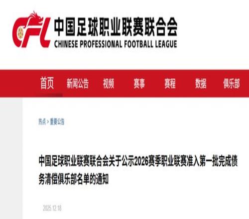 本通知所公示俱乐部为第一批完成债务清偿的俱乐部名单,中足联将视俱乐部解决债务清偿的具体情况,适时公布第二批完成债务清偿的俱乐部名单。中足联将细致审核各俱乐部提交的准入材料,只有通过债务清偿公示及其他准入材料审核的俱乐部,方可获得2026赛季各级职业联赛的准入资格。特此通知。