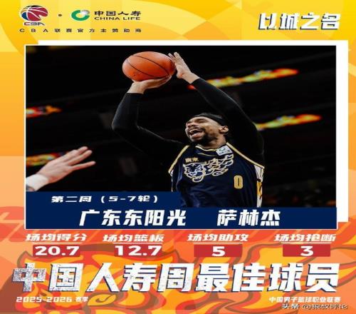 北京时间12月29日,根据CBA官方的公示,2025-2026赛季CBA联赛常规赛第二周中国人寿周最佳球员,分别是萨林杰,以及贺希宁。