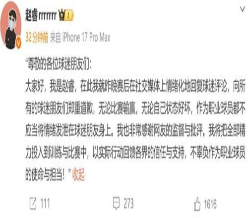 赵睿就“情绪化回复球迷评论”致歉:无论比赛输赢都不应当将情绪发泄在球迷朋友身上